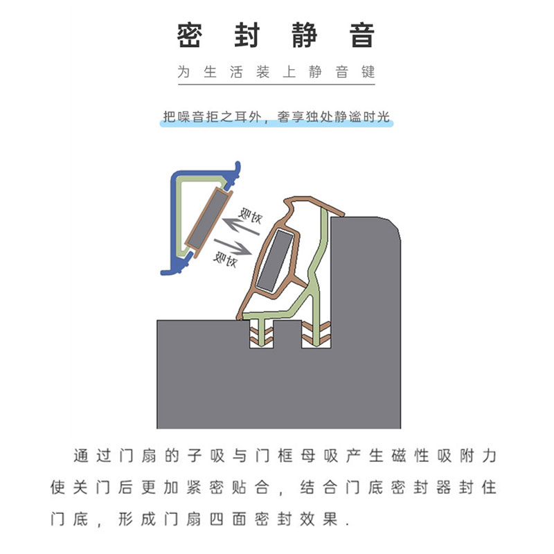 主要在40mm厚以上的門扇使用,通過門扇與門框上的正負(fù)極磁力吸附來加強(qiáng)門扇的密封,達(dá)到降低噪音的效果。開關(guān)門時伴隨磁力的感覺也讓門有更強(qiáng)科技感。